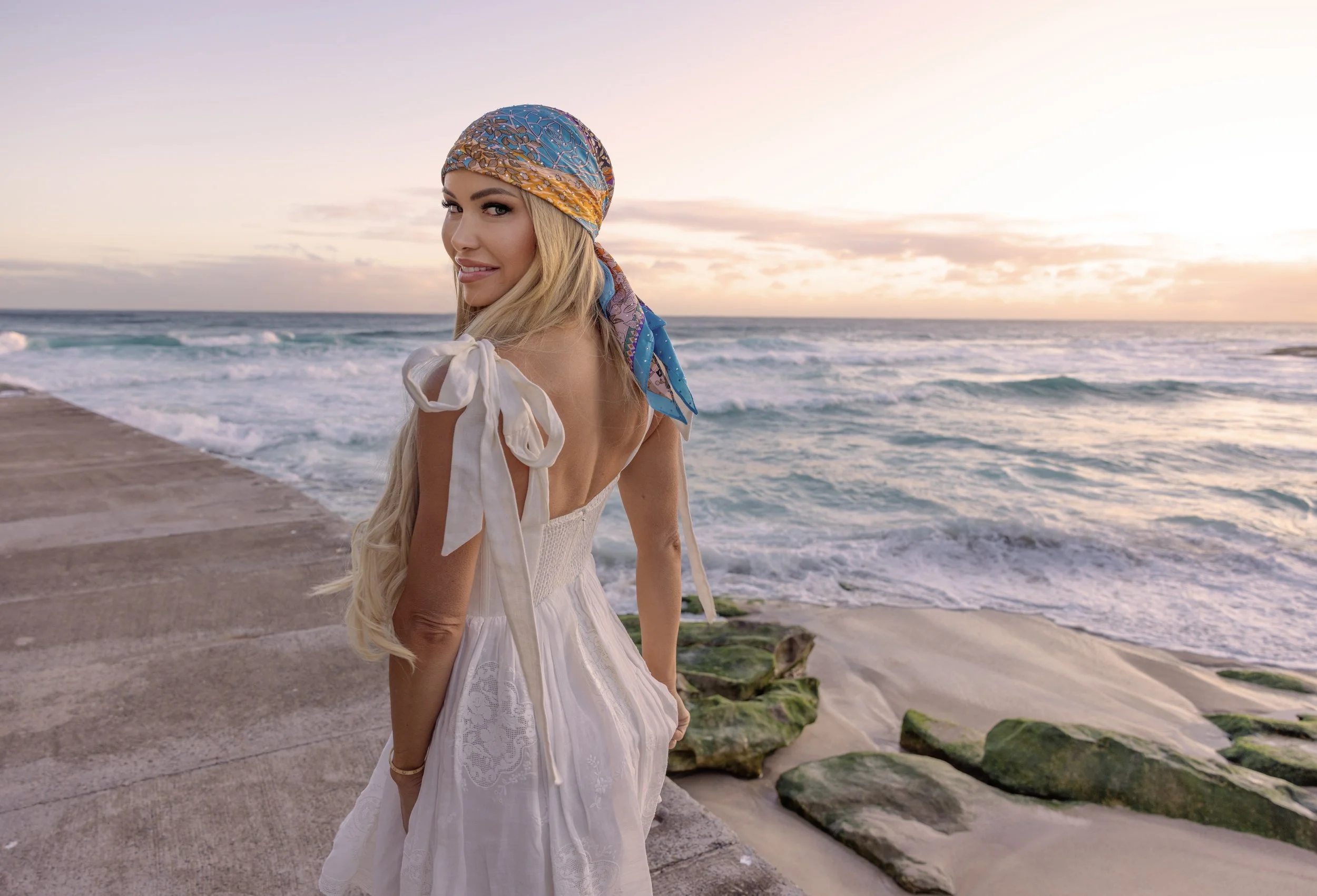 Each scarf is designed for jewelled moments, to be tied, twisted & adored.